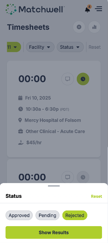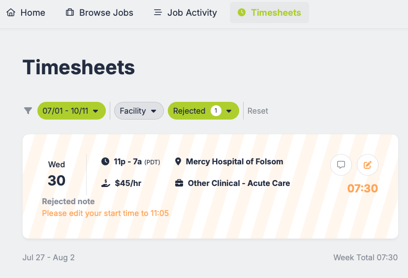 If your time entry gets rejected, we will notify you based on your notification preferences and an alert will appear at the top of your Home page. Click on the alert, or choose Timesheets from the menu and select Rejected in the status filter. Any rejected time entries will be listed here.